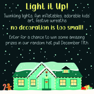 It’s time to bring some sparkle to our neighbourhood! Whether it’s twinkling lights, festive inflatables, or creative displays of kids’ artwork in your windows — any holiday-themed exterior decoration counts!